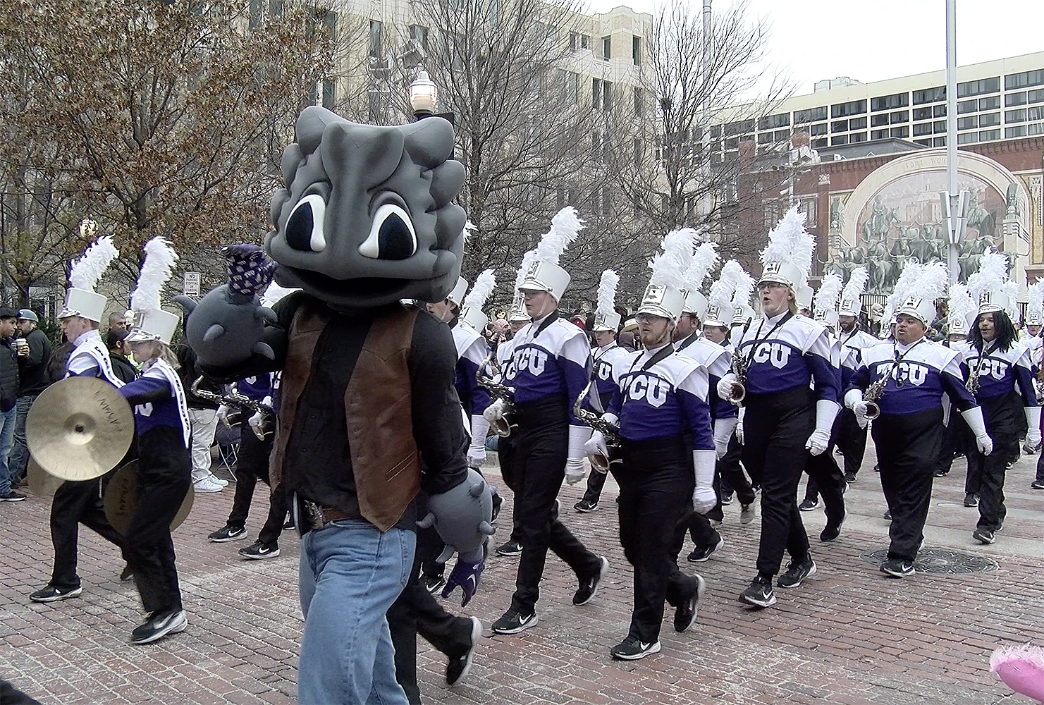 The TCU Band & Mascot during a parade appearance